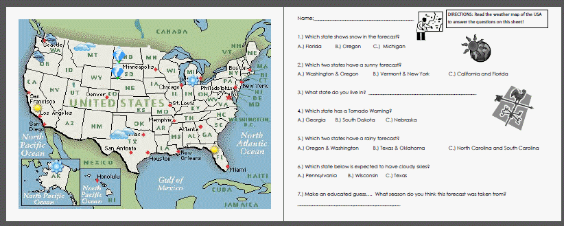 looked like snow. ~ Have students write their own story. Maybe something besides food falls from the sky! ~ Have each student share their favorite part. They can create a poster showing their favorite part of the story. They will then show the class their poster and discuss why this was their favorite part. ~ Give students newspapers and have them cut out weather words and pictures. Have them make a collage on construction paper. ~ Ask students if they would enjoy living in a place like Chewandswallow. Then list the positive and negative aspects of living in such a place. Some Ideas From Our Weather Packet - Click Here to Learn More.